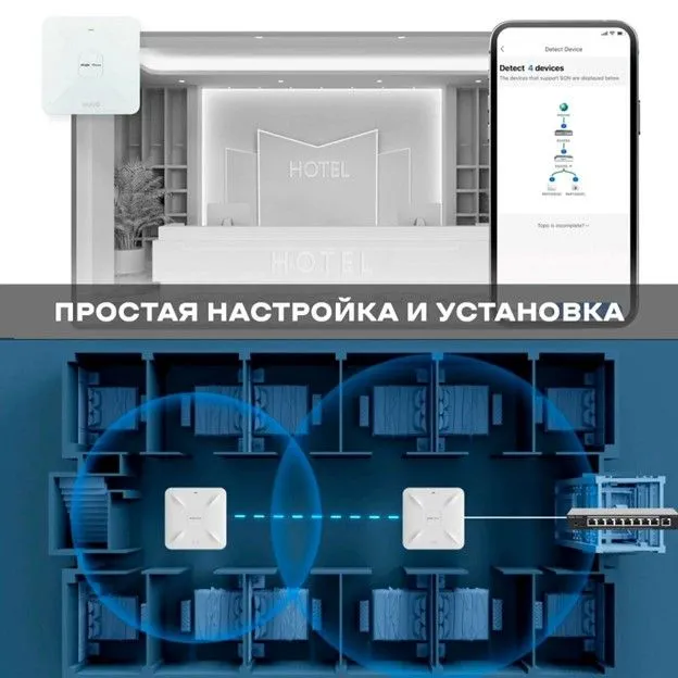 Добавьте к этому быструю и удобную установку оборудования за считанные минуты за счет продуманной системы крепления, настройку и удаленный контроль через надежное бесплатное облако Ruijie Cloud. Доступны функции интеллектуальной оптимизации беспроводной сети и аутентификацией в облачном портале.